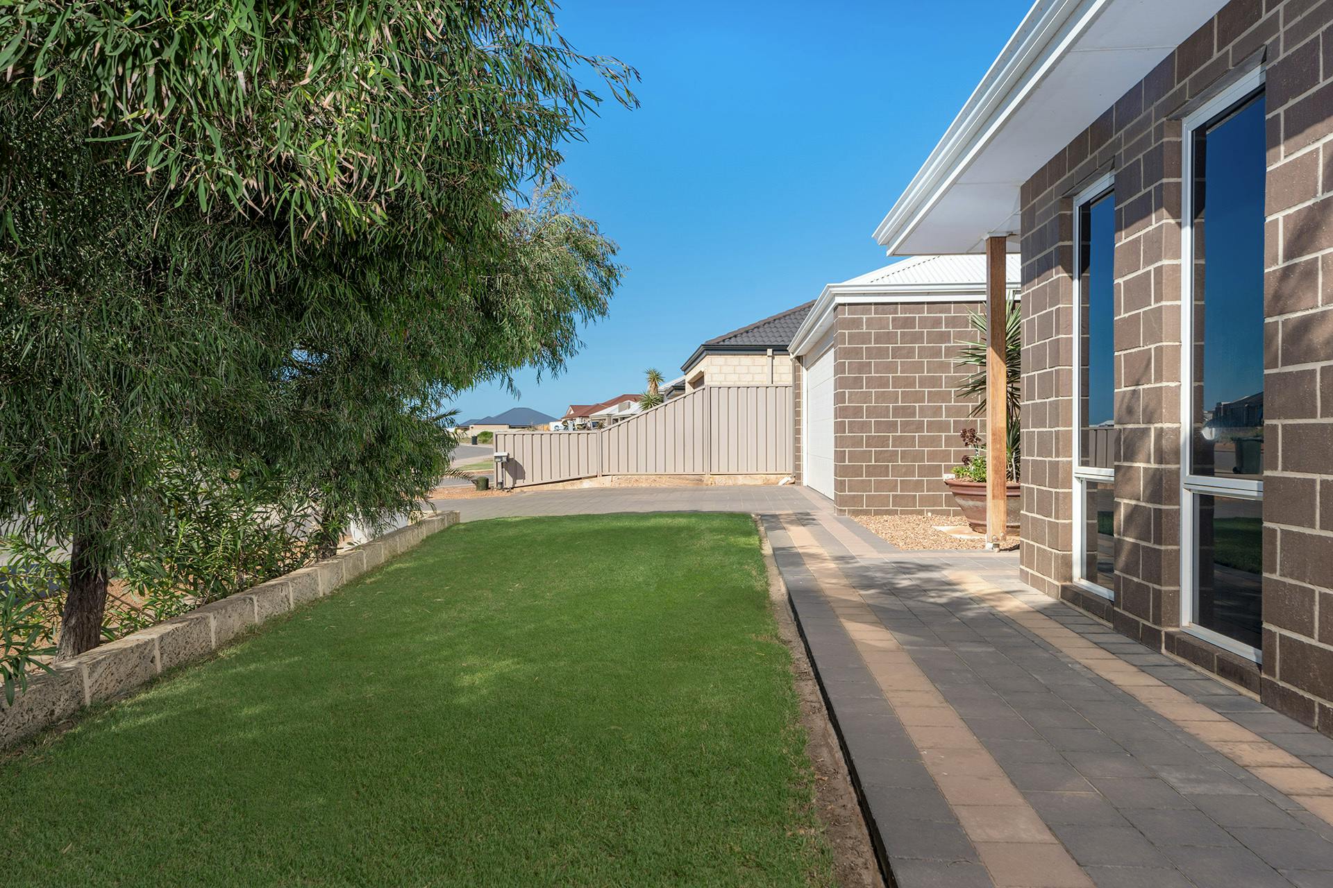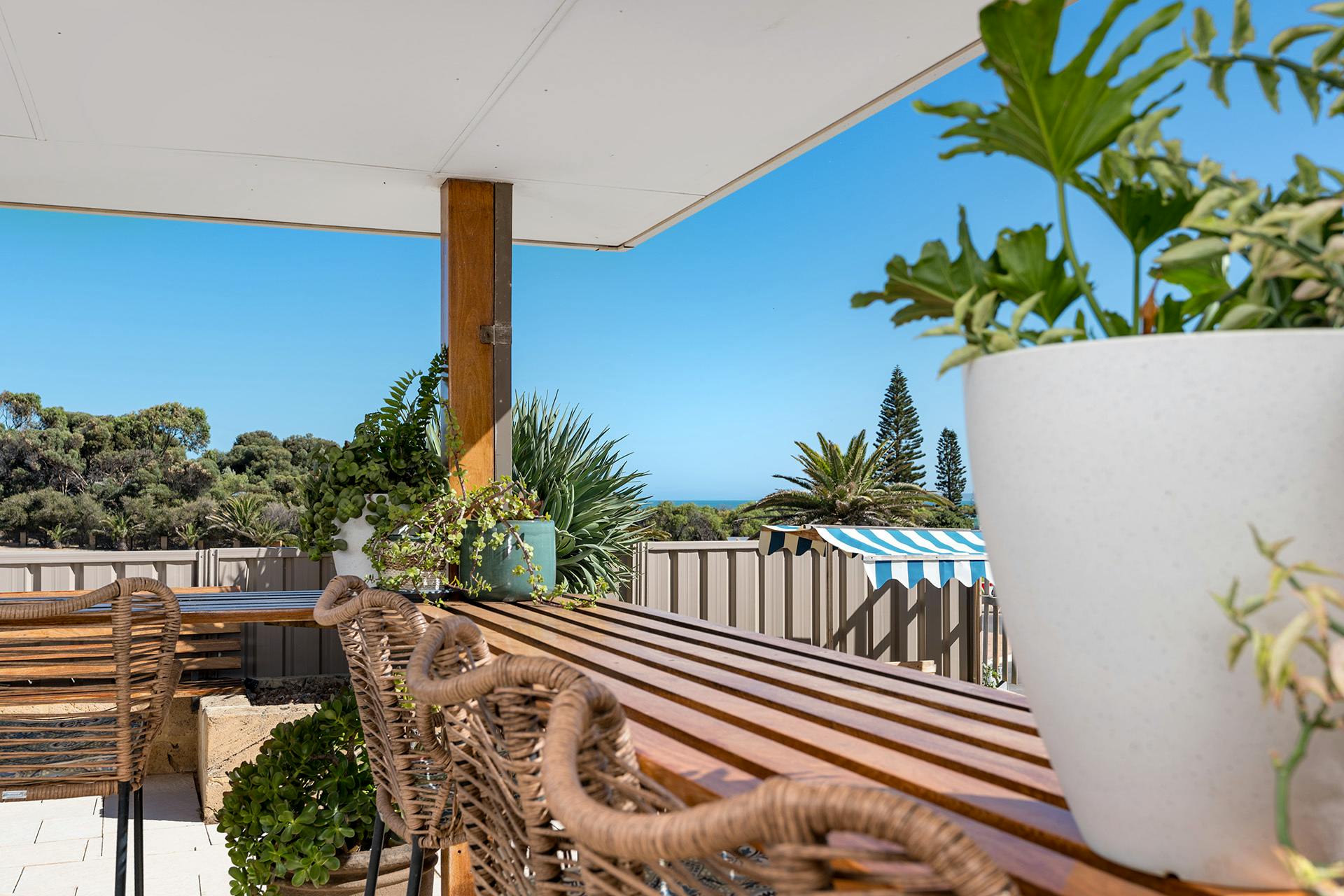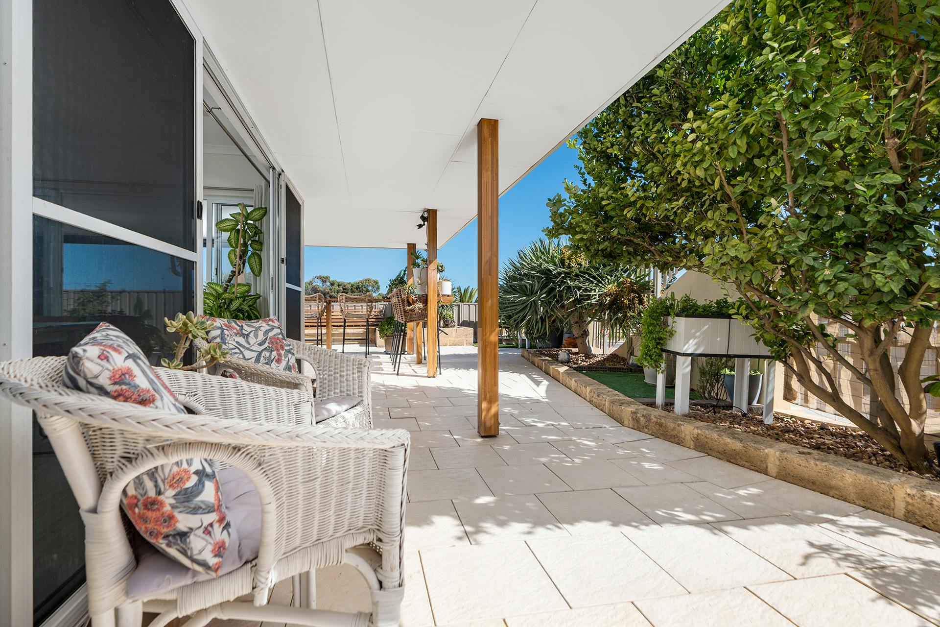 Outdoors, easy care, and well-maintained gardens provide a sense of privacy and greenery, complementing the home's relaxed atmosphere and enhancing its overall appeal.