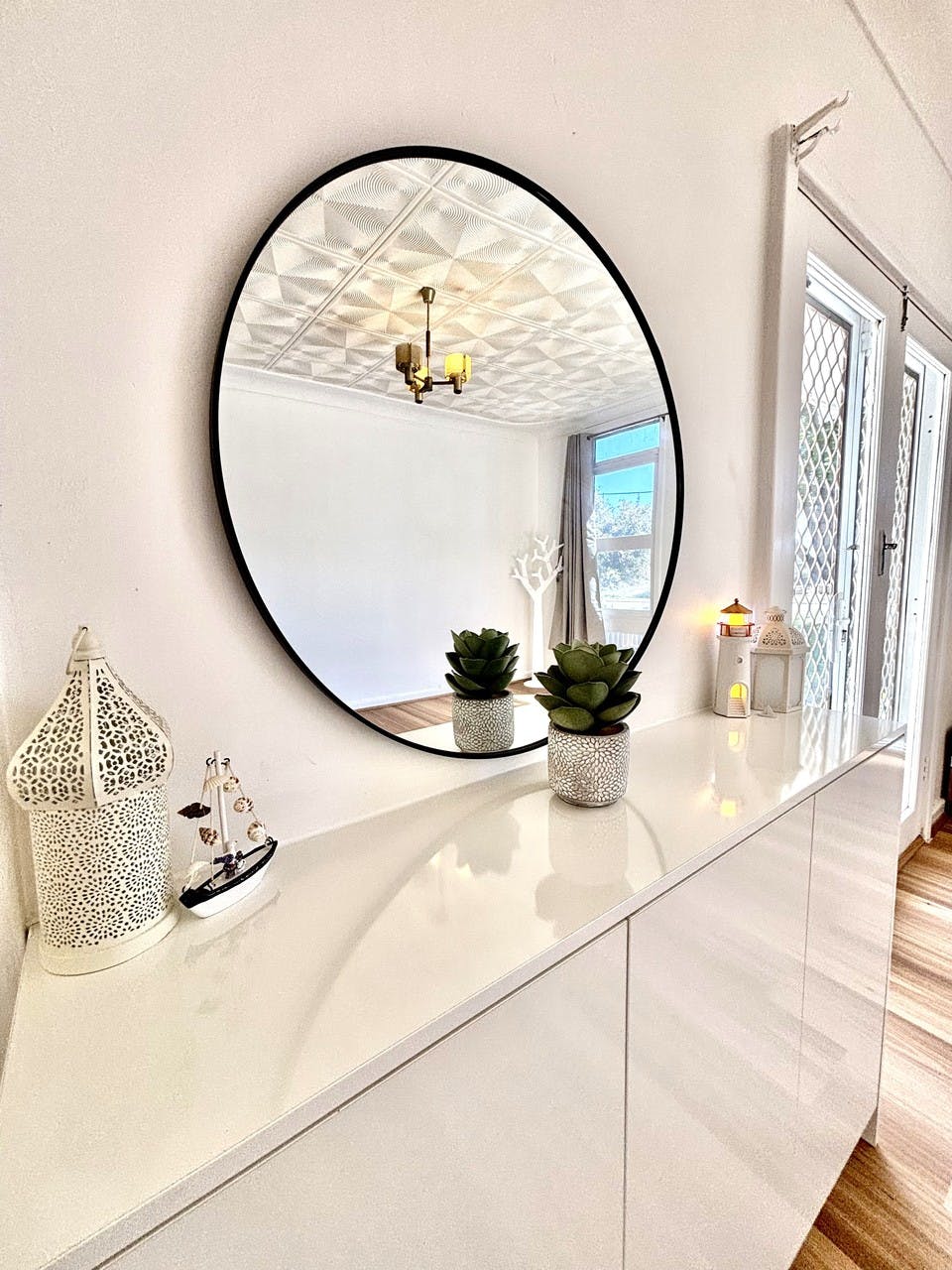 - Spacious loungeroom with newly fitted tv cabinet and sideboard, new fan with fitted lighting and new crim mesh front covers to all windows.